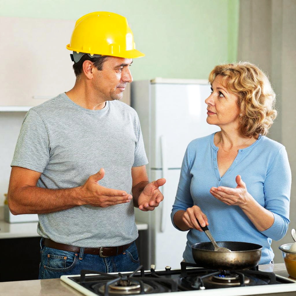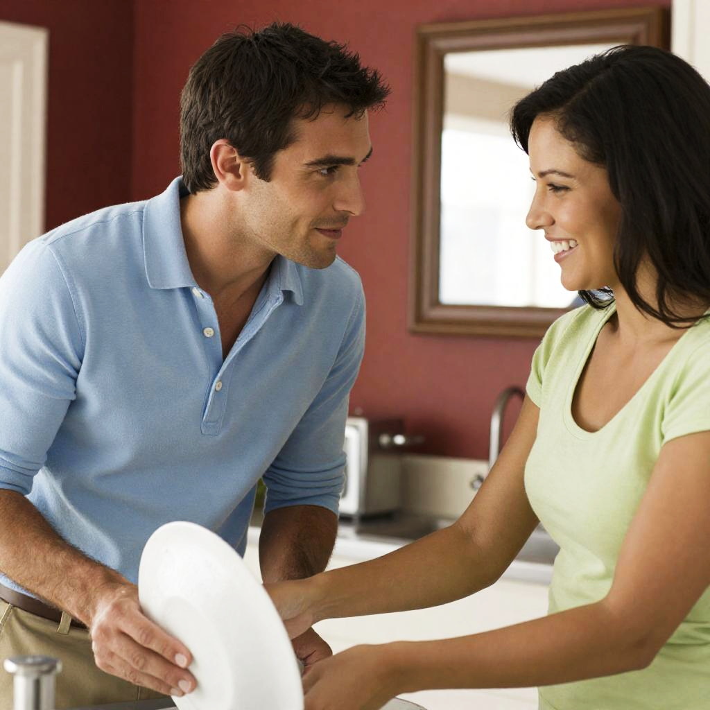 Photograph of three people in a kitchen. Middle-aged man in white tank top pours from a metal pot into a large bowl held by a middle-aged woman in a red sweater. Young woman in blue tank top holds another bowl. Tray with raw meat in foreground. All three look focused. Beige cabinets and white tiles in background.