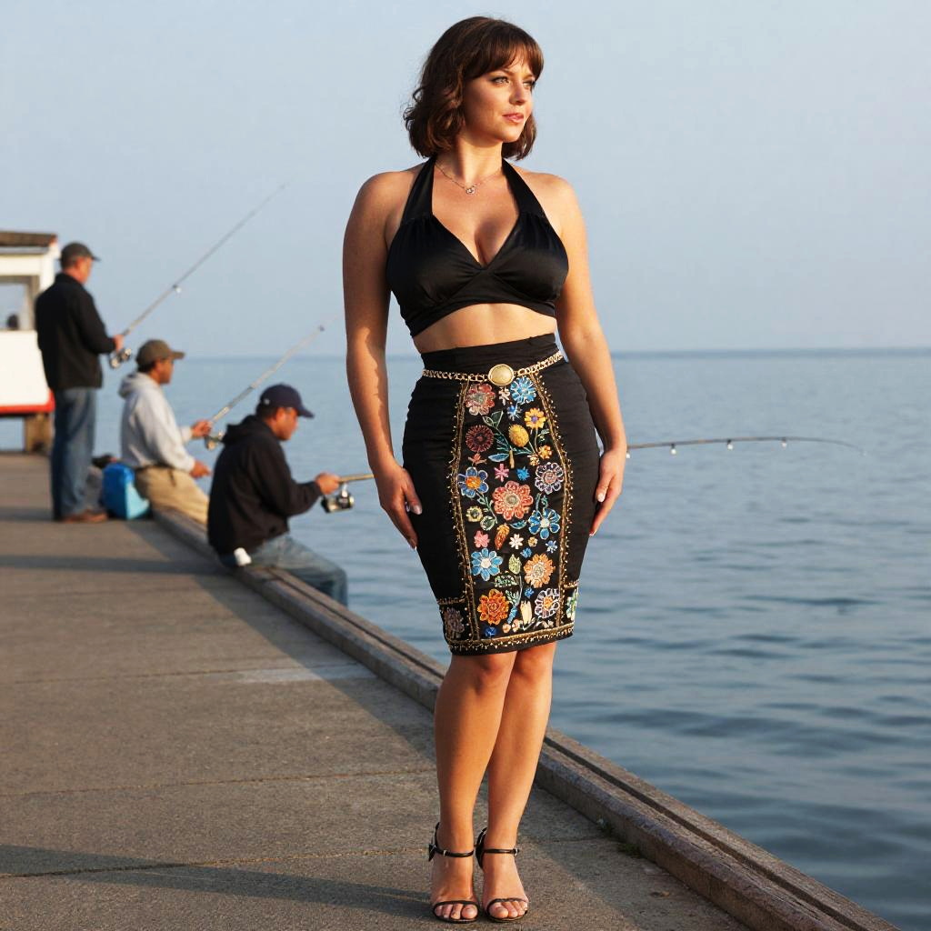 A stocky woman in a vintage photo style, wearing a black halter-neck crop top and a high-waisted embroidered pencil skirt, stands confidently at a fishing pier with anglers, her gold chain belt and strappy heels catching the light as she gazes out at the water. Sexy. Pretty face and beаutiful eyes. Big breasts