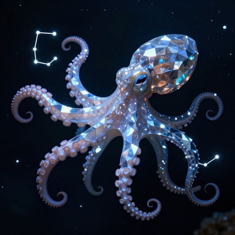 Digital CGI of a glowing, crystal-like octopus with shimmering blue and white facets, floating in a starry, dark space background. Constellation