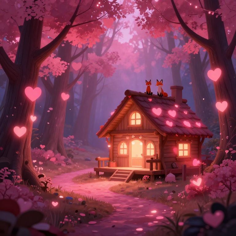 Digital illustration of a cozy cabin decorated with heart shapes and glowing warm pink lights in a mystical forest. The scene features heart-adorned trees with pink foliage, a winding illuminated path, and two foxes sitting on the cabin roof. The setting evokes a romantic Valentine's Day atmosphere with soft mist and enchanting colors.