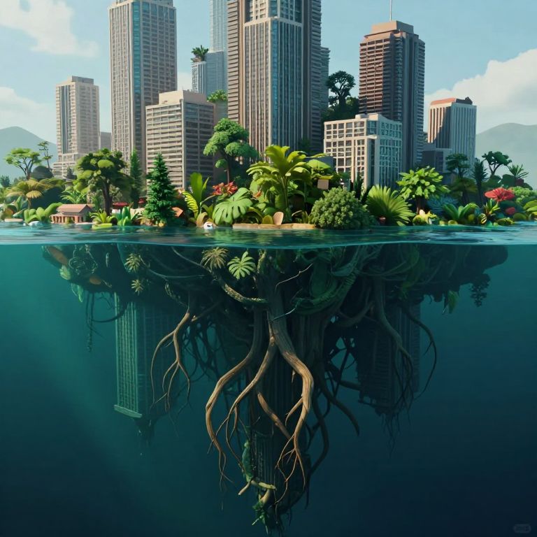 Digital artwork: Cityscape above water, lush tropical island below with exposed roots and underwater reflection of skyscrapers, clear blue sky.