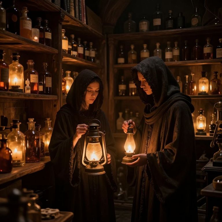 In a dimly lit apothecary bathed in the glow of flickering lanterns, two cloaked figures stand amidst shelves of amber-hued bottles, each containing whispers of forgotten dreams—where the scent of aged wood and earthy tinctures intertwines with the quiet ache of longing and the promise of rediscovery.