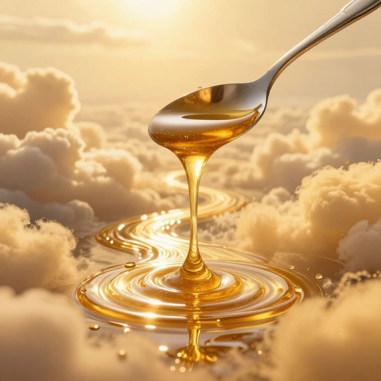 Golden honey cascades from a gleaming spoon, forming shimmering rivers that meander through a celestial landscape of fluffy, golden clouds, as sunlight bathes the scene in radiant warmth.