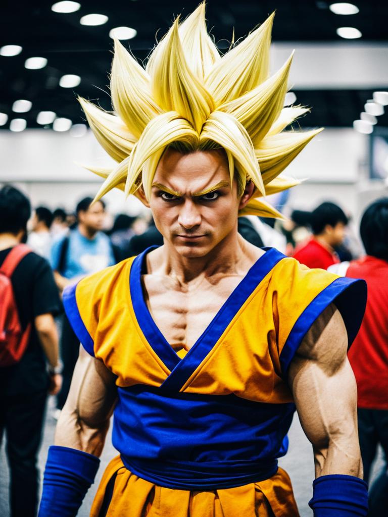 Man in Super Saiyan Costume, candid cosplay portrait at anime convention