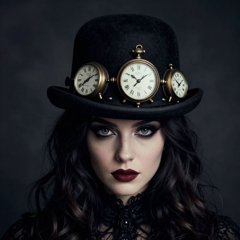 Photograph of a pale-skinned woman with striking blue eyes and dark, wavy hair wearing a black, velvet top hat adorned with four gold pocket watches displaying different times. She has dark, dramatic makeup with bold red lipstick. Her black lace-trimmed blouse contrasts with the dark, smoky background. The image has a Gothic, steampunk aesthetic, emphasizing a mysterious and vintage vibe. The lighting highlights her face and the pocket watches, casting soft shadows for a dramatic effect.