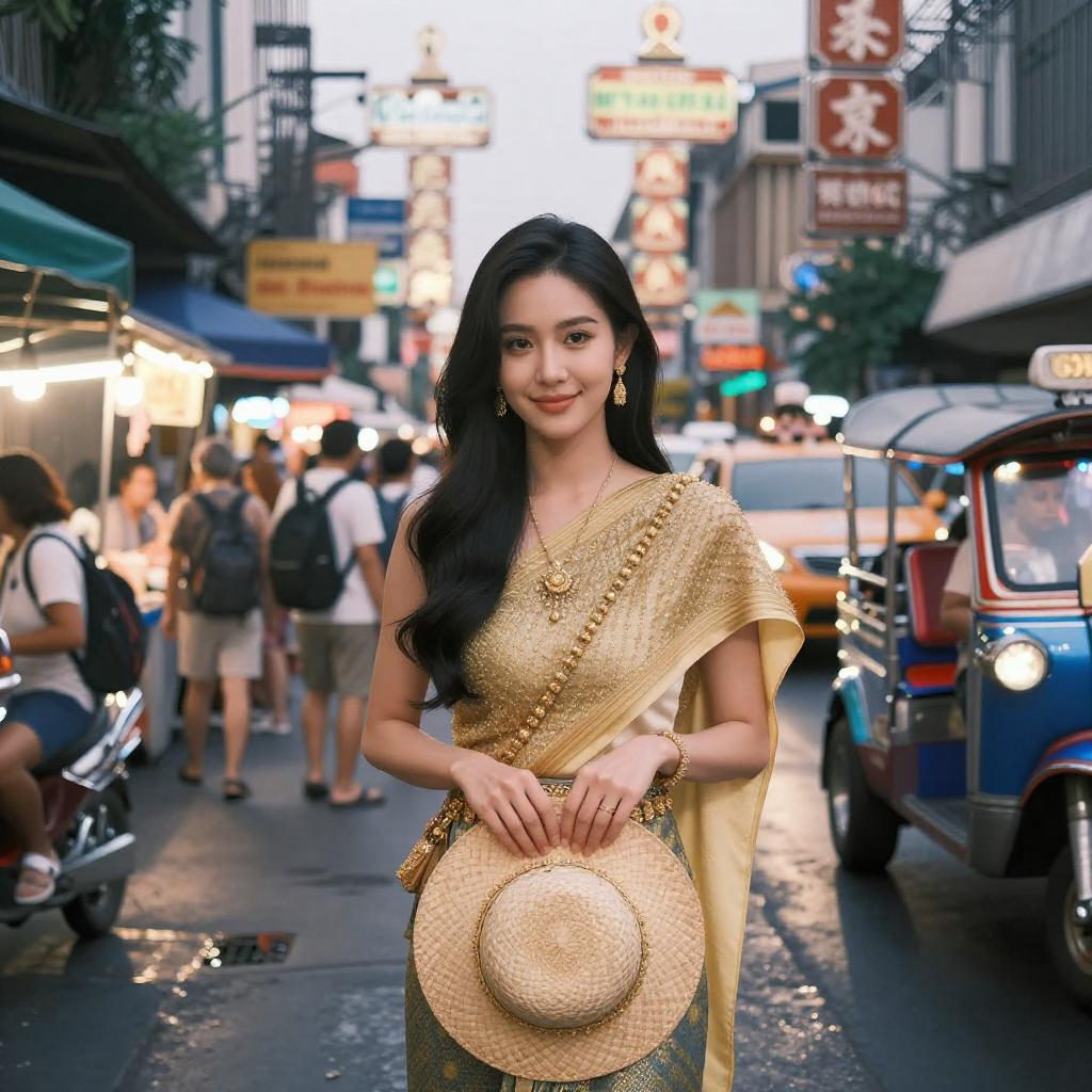 Portrait of an elegant Thai woman with long glossy black hair wearing a modernized gold-accented sabai dress and delicate jewelry. She holds a woven straw hat and stands on the neon-lit Khao San Road in Bangkok, known for its crowded backpacker stalls, street food carts, vibrant bar signs, and tuk-tuks. The wet pavement reflects evening lights, creating a misty, atmospheric street scene at dusk.