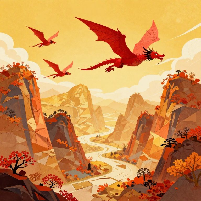 A vibrant digital illustration captures the majestic mountains cloaked in autumn hues, where fiery red dragons soar gracefully against a golden sky, embodying the mythical migration of paper dragons as travelers' poems guide their journey through the crumpled folds of the landscape.