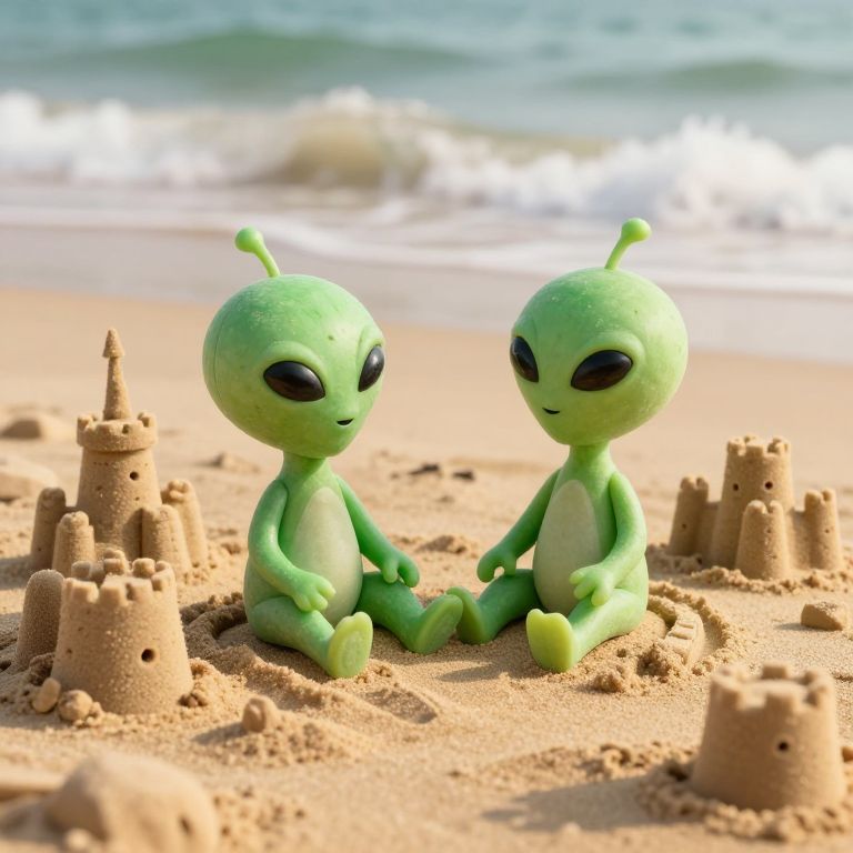 Two whimsical alien figures, crafted in a hyper-realistic 3D rendering style, sit playfully on a sandy beach, surrounded by intricate sandcastles that evoke a blend of fantasy and nostalgia, as waves gently lap in the background under golden-hour lighting.