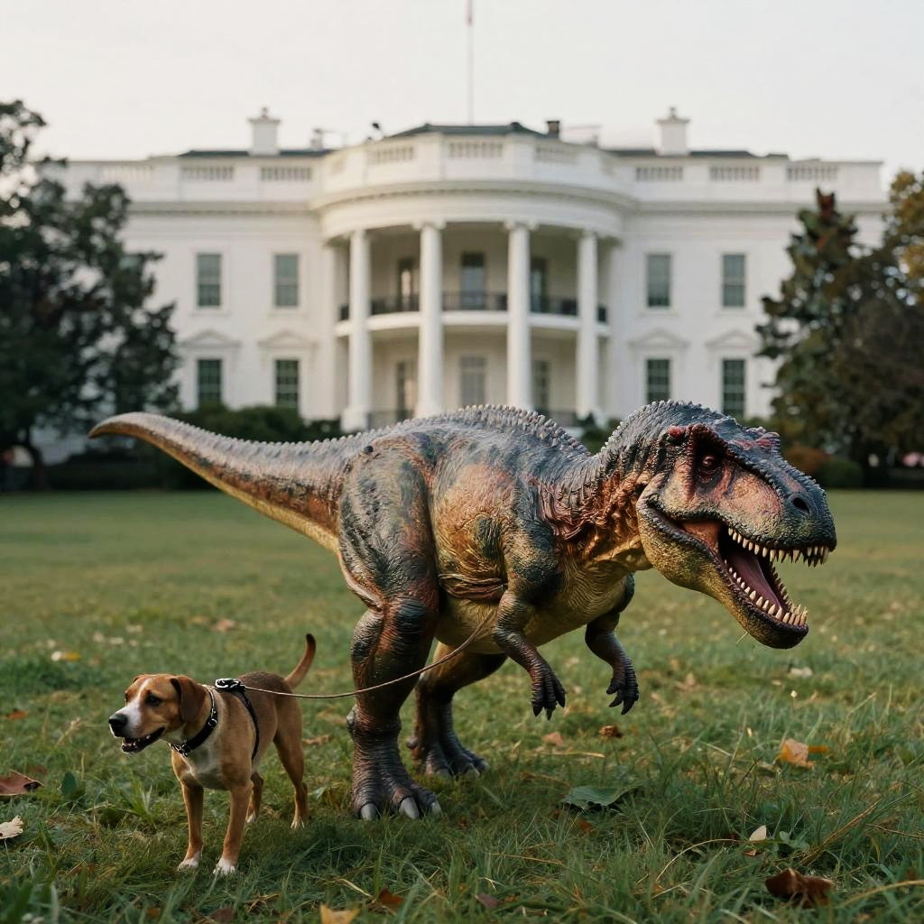 Cinematic photo of a large, realistic dinosaur model on a leash being walked alongside a small dog on the lawn in front of the White House, Washington D.C. The scene features natural lighting with rich, intricate details and atmospheric bokeh in the background. The dinosaur resembles a Tyrannosaurus rex with textured skin and open jaws, creating a photorealistic and imaginative contrast in a historical setting.