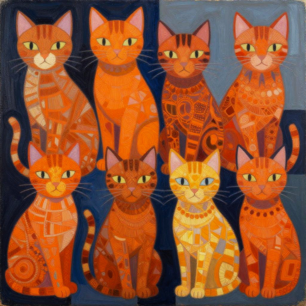 This digital painting features seven stylized, orange tabby cats with yellow eyes, arranged in two rows against a dark blue background. Each cat is adorned with intricate, geometric and swirling patterns in varying shades of orange and yellow, giving a mosaic-like appearance. The cats have distinct, symmetrical markings and sit in a variety of poses—some facing forward, others slightly angled. Their expressions range from neutral to mildly curious. The texture is smooth with a painterly style, and the overall composition creates a visually engaging, symmetrical pattern. The cats' fur and patterns are highly detailed, contrasting vividly with the dark background.