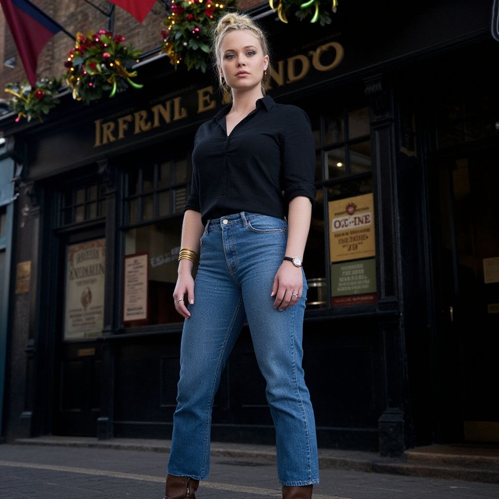 Photograph of a blonde woman standing confidently in front of an Irish Endo pub. She wears a black, long-sleeve, button-up shirt, blue jeans with a slightly flared cut, and brown ankle boots. Her hair is tied back in a neat ponytail, and she accessorizes with gold bracelets on her right wrist. The pub's black-framed windows display various posters, and festive garlands with red and green decorations hang above the sign. The street is paved, and the background includes a brick building. The woman's expression is neutral, and she stands with her hands by her sides.
