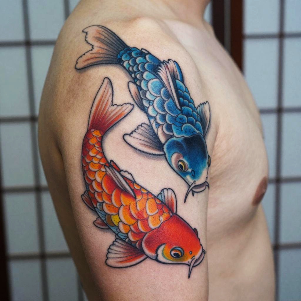 Add tattoo to photo featuring colorful traditional Japanese koi fish wrapping around the upper arm, dynamic composition, natural light, sharp focus, vivid colors, fine line work, ultra detailed skin texture