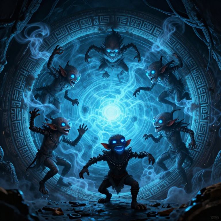 Digital fantasy artwork depicting a dark, blue-lit cave with a glowing blue vortex at the center. Five shadowy, demonic creatures with glowing blue eyes and sinister grins surround a central figure, also demonic, who stands with arms outstretched. The creatures have tattered clothing, clawed hands, and pointy ears. The background features intricate, circular patterns resembling ancient Greek designs. Blue, ethereal smoke swirls around the vortex, enhancing the mystical atmosphere. The central figure's exaggerated grin and glowing eyes contrast with the dark, shadowy surroundings, creating a dramatic, otherworldly scene.