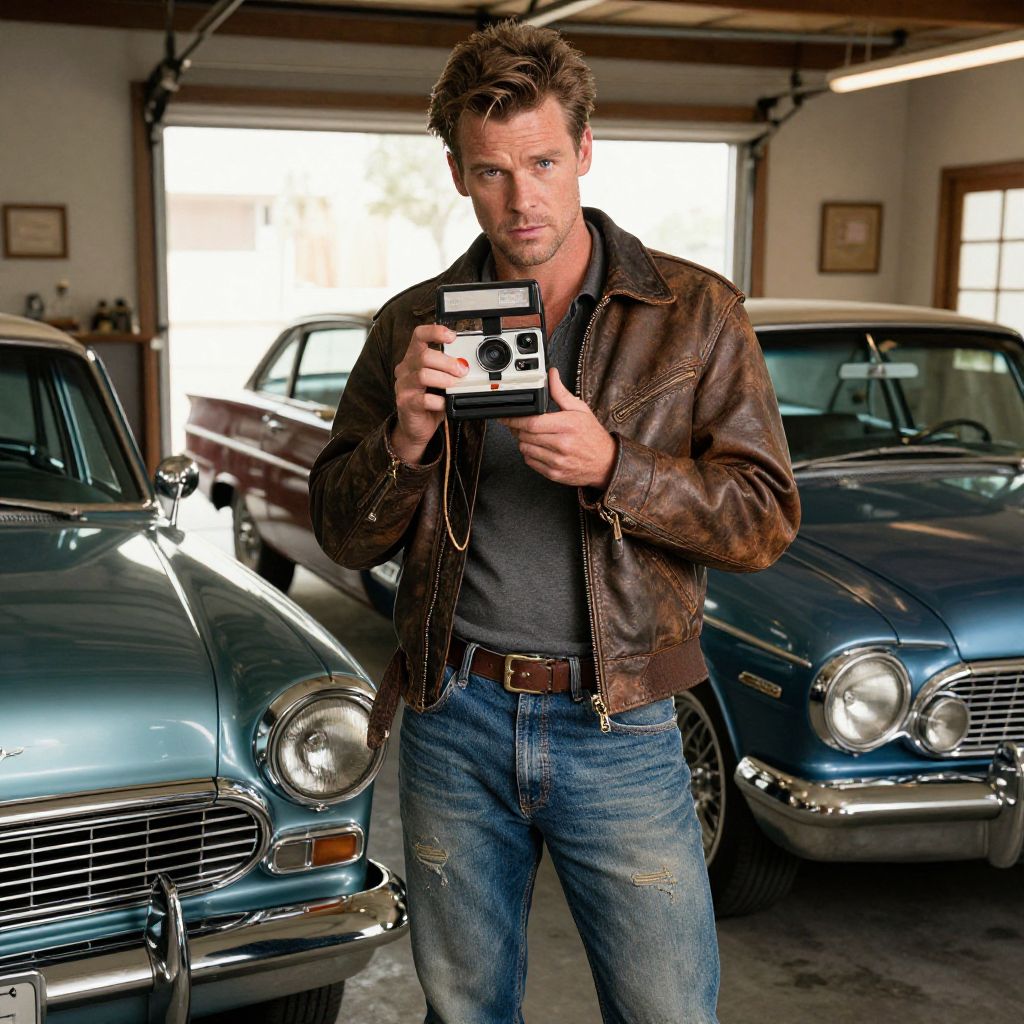 Vintage garage scene: A ruggedly handsome man, dressed in worn denim jeans and a faded leather jacket, stands proudly amidst an array of gleaming classic cars, their chrome accents reflecting the warm sunlight streaming through the open garage door. The air is thick with nostalgia as he holds a vintage Polaroid camera, capturing memories of his beloved automobiles. Soft Man has masculine face and piercing eyes
