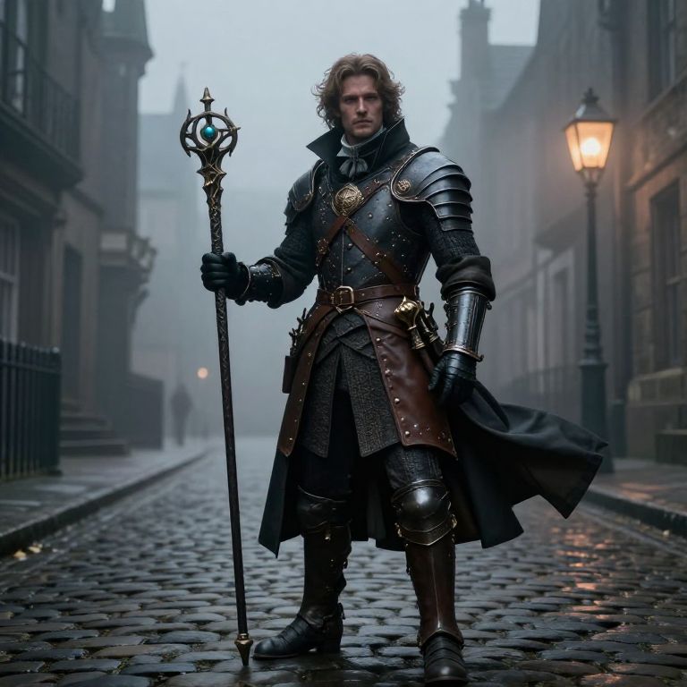 Victorian DnD character standing in a foggy cobblestone street, wearing intricate leather armor mixed with Victorian-era clothing, holding a mystical arcane staff, dark trench coat fluttering, ambient gaslight glow, gothic architecture in the background, moody and atmospheric.