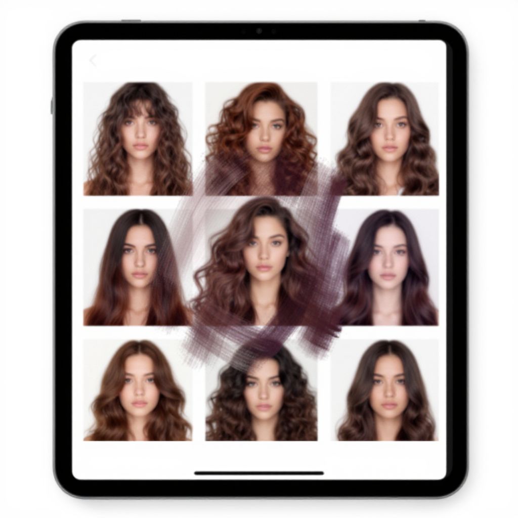 A young woman using a virtual wig try on app on her tablet, experimenting with different bob and curly hairstyles, vivid colors, interactive augmented reality overlay, high resolution, clean aesthetic, natural expression, vibrant and engaging environment.