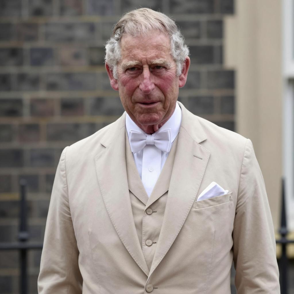 Prince charles fancy dress, photograph of elderly man, wearing beige suit, white shirt, white bow tie, beige waistcoat, white pocket square, standing in front of brick wall, natural light, serious expression, short gray hair, light skin, daytime, outdoor, classic formal attire, upper body shot, realistic style
