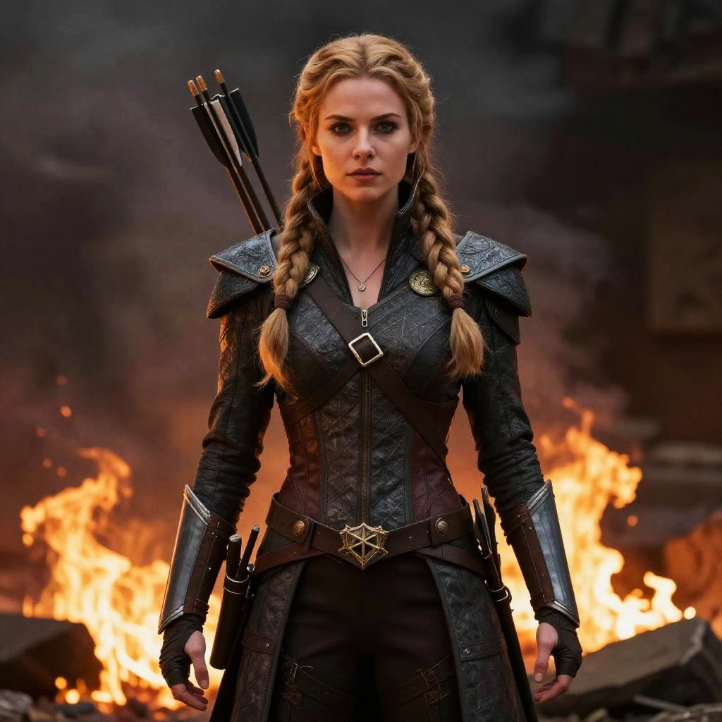 Photorealistic CGI image of a blonde woman with braided hair, wearing a black, armored outfit with intricate leather and metal details, including shoulder pads and a diamond-shaped brooch. She has a serious expression and holds a quiver of arrows on her back. In the background, bright orange flames and dark smoke create a dramatic, fiery atmosphere. Her outfit is adorned with multiple belts and pouches, emphasizing a warrior-like appearance. The lighting highlights the textures of her armor and the intensity of the fire.