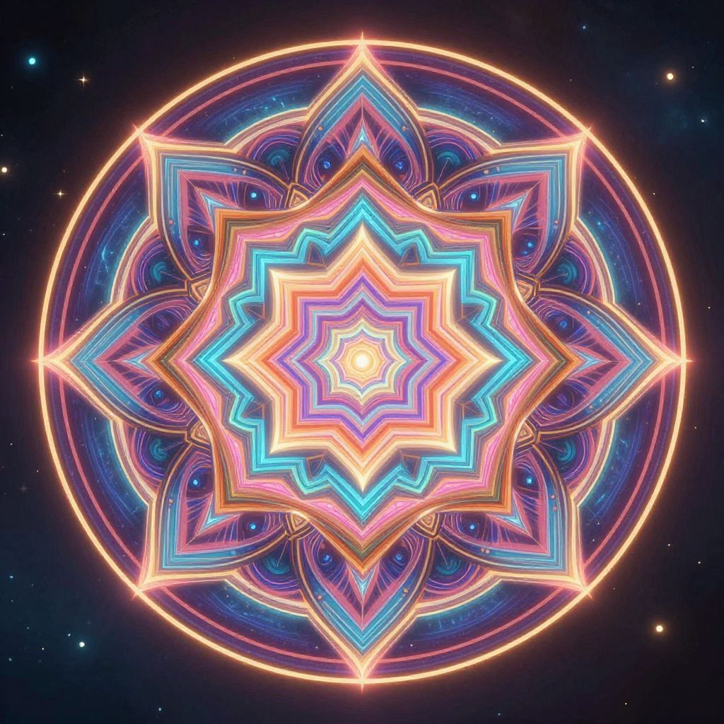 Mandala generator design, intricate circular patterns with vibrant colors and symmetrical shapes, complex geometric forms blending traditional and digital art styles, glowing lines, high detail, serene and meditative atmosphere, modern ambient background