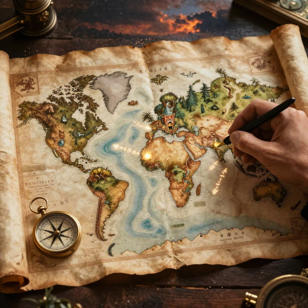 Fantasy world map maker crafting an ancient parchment map with intricate kingdoms, mythical creatures, forests, mountains, and enchanted seas, detailed with glowing runes and a vintage compass, under a mystical twilight sky.