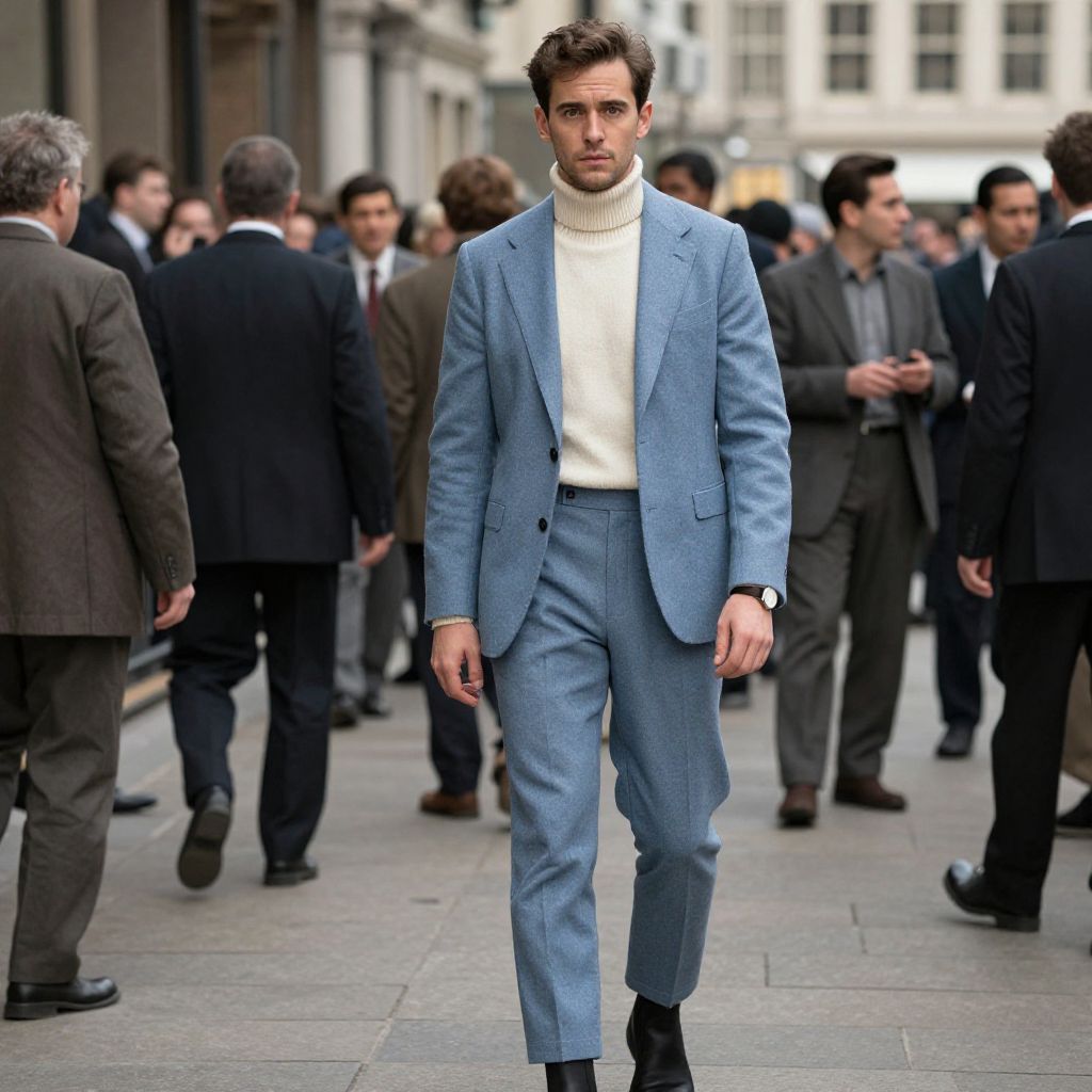 A man, slate blue suit, ivory merino wool turtleneck, gray dress shirt, black Chelsea boots, minimalist leather watch, bustling traders in suits, vintage photo, confident expression Man has masculine face and piercing eyes