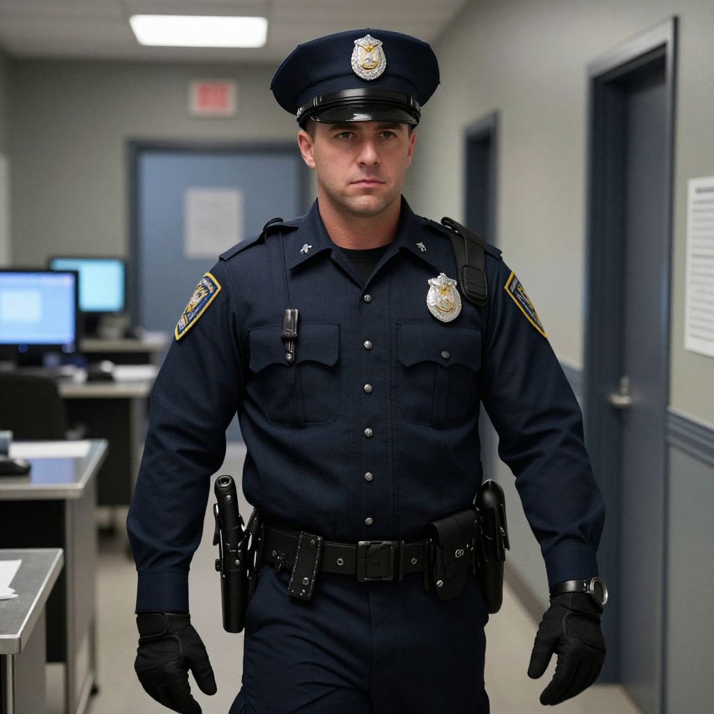 Photograph of a serious-looking male police officer in a dark blue uniform, black gloves, and cap, standing in a modern, brightly lit office hallway