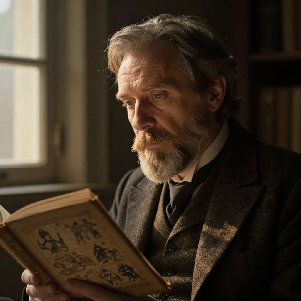 A photograph of an older Caucasian man with a rugged, weathered face, gray beard, and slightly disheveled gray hair, sitting in a dimly lit room. He wears a dark, textured wool suit over a white shirt and black tie. He is intently reading an old, ornate book with illustrations on the cover. Natural light from a window on the left casts a warm, dramatic glow on his face, highlighting his deep-set eyes and thoughtful expression. The background is dark and blurry, focusing attention on the man and his book. The overall mood is contemplative and scholarly.