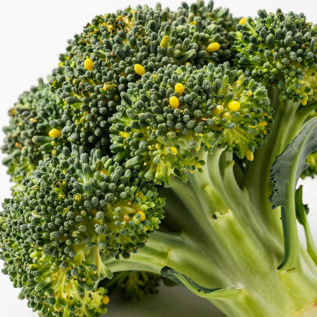 This is a close-up photograph of a bunch of fresh broccoli florets, filling the entire frame. The broccoli is vibrant green with tiny yellow buds scattered throughout, and a single leaf is partially visible on the right side. The texture is bumpy and dense, showcasing the detailed, compact structure of the florets. The lighting is even, highlighting the natural colors and textures.