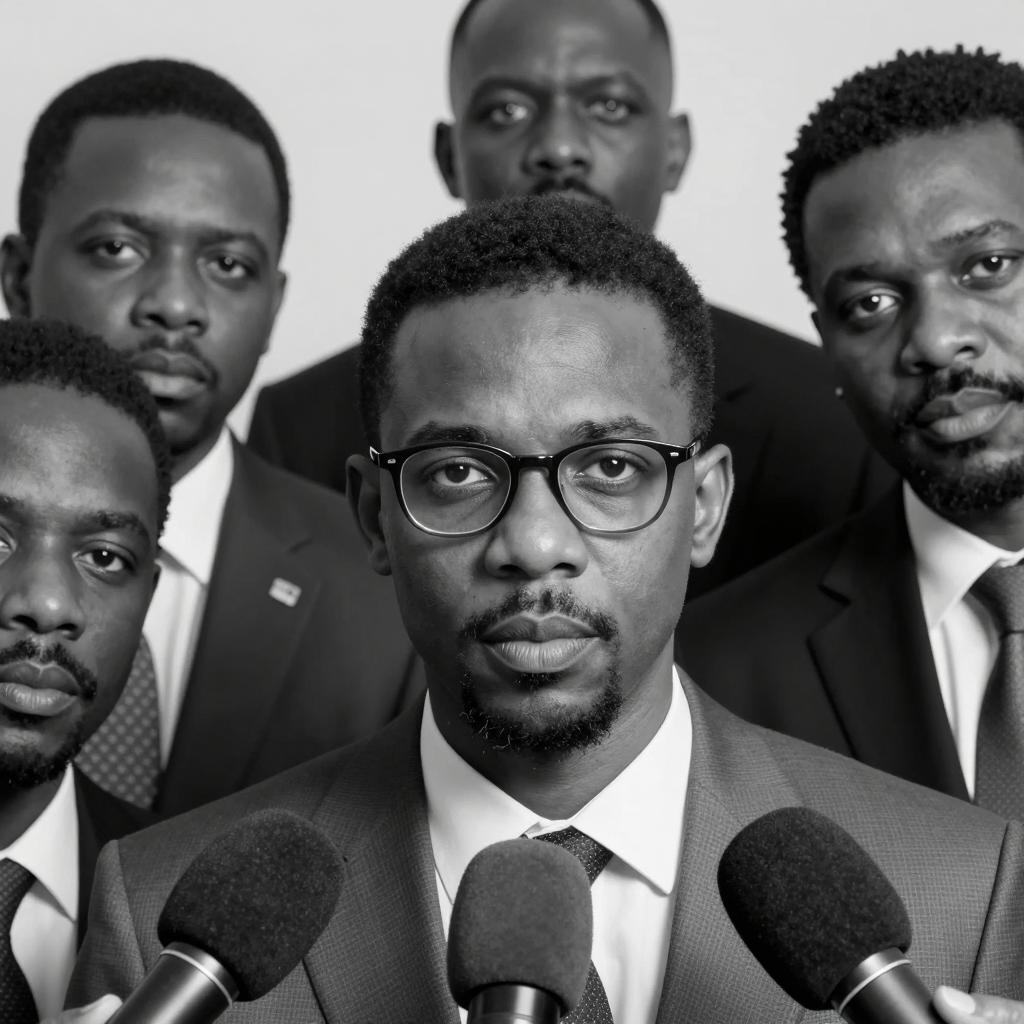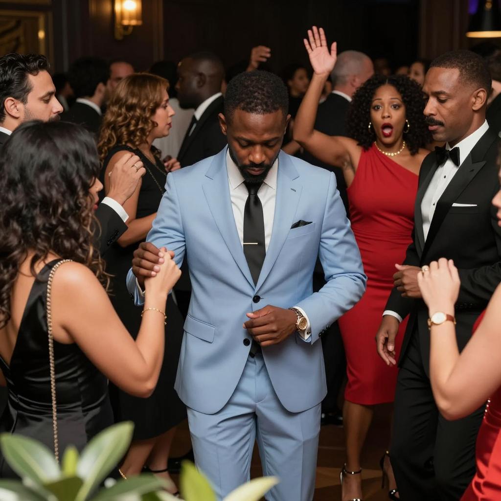 Photograph of six Black men in formal attire standing in a luxurious, ornately decorated room. Central figure, in dark suit, embraces man in green blazer with white shirt, hand on chest. Four men stand behind, one to the left, two to the right, one in foreground. Intense expressions on central figures. Elegant patterned wallpaper, wood-paneled door in background.