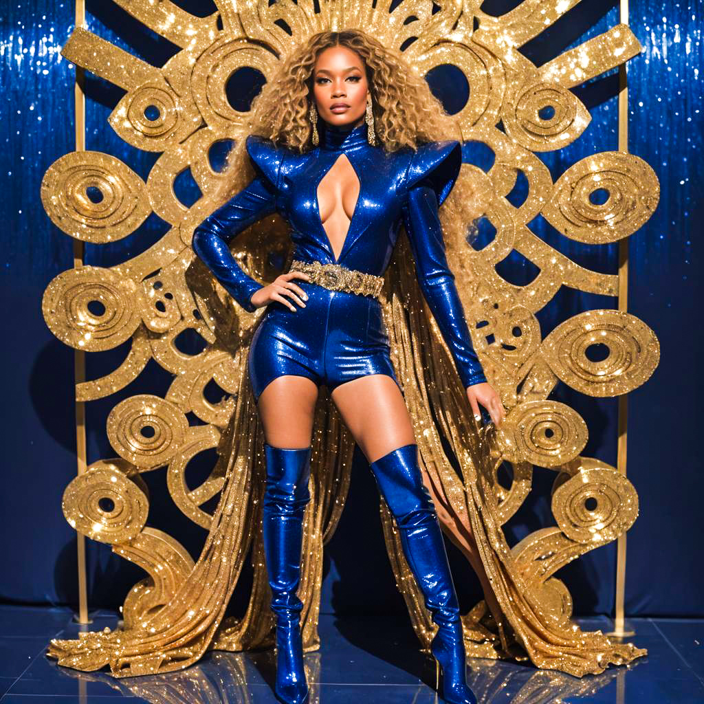 Photo of a Slender Thighs woman, Curly Top, beyonce concert outfit, glamorous sequined bodysuit in Indigo with Cotton fabric, metallic gold thigh-high boots, high heels, statement jewelry, bold futuristic pop diva style, gallery opening, digital photography