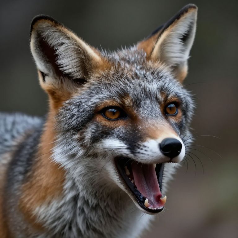 Band grey fox yawning, headshot, cyberpunk style, detailed, fantasy, ultra detailed, realistic fur, piercing brown eyes, 40k,