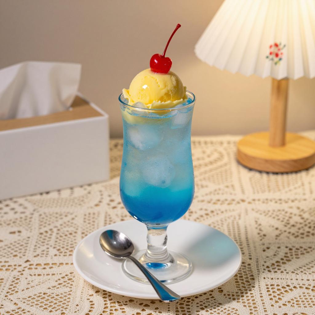 Blue ice drink in a glass with a yellow scoop, cherry on top, on a white plate with a silver spoon. Background: lace tablecloth, white tissue box, lamp with floral lampshade. Image has warm lighting. Drink has ice cubes.