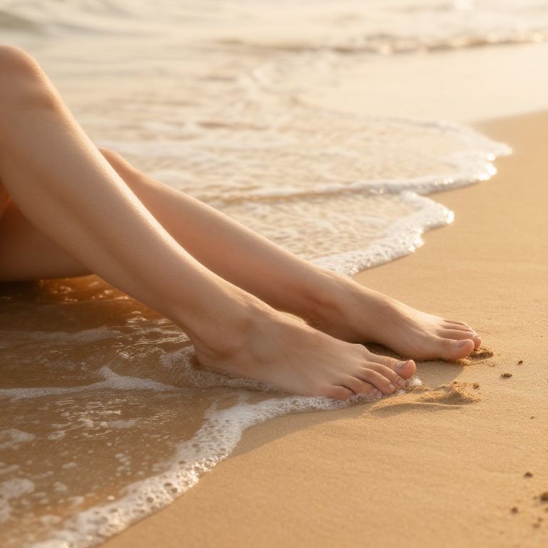 Beautifulfeet in a serene beach setting, soft golden sand, gentle waves washing over smooth skin, sunlight casting warm reflections, natural and relaxed pose, high detail, photorealistic style, calming and peaceful atmosphere