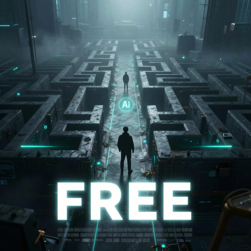 Free AI movie poster generator illustrating a mysterious digital maze with glowing pathways and AI symbols, ethereal fog covering the environment, futuristic fonts and holographic overlays, cinematic atmosphere, deep shadows highlighting the complexity.