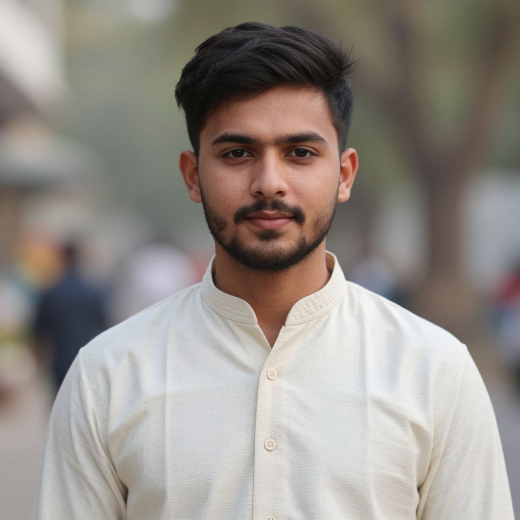 Bandhgala punjabi suit, 1boy, male focus, solo, facial hair, black hair, beard, blurry, realistic, looking at viewer, blurry background, mustache, outdoors, upper body, black eyes