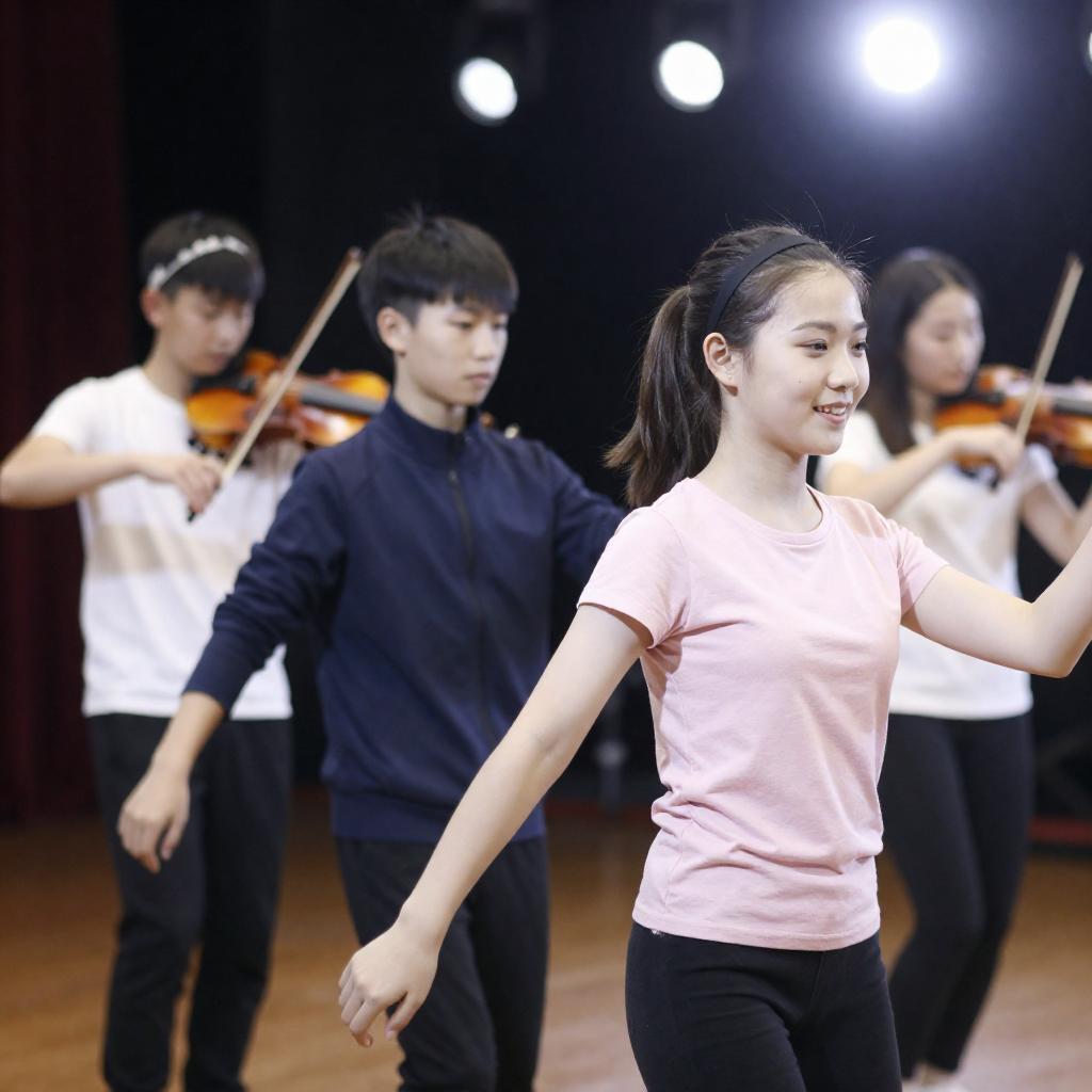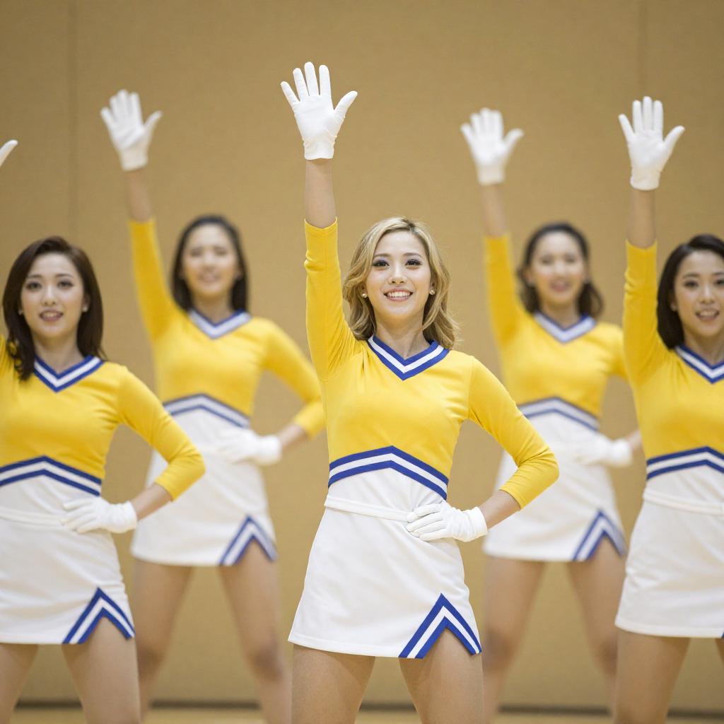 Black-and-white photograph of a lively dance performance on stage. Cheerleaders with large, fluffy pom-poms and short skirts dance energetically, surrounded by male dancers in white shirts and dark pants. One male dancer raises his arms triumphantly. The background shows stage lights and equipment. The dancers' expressions are joyful and animated.