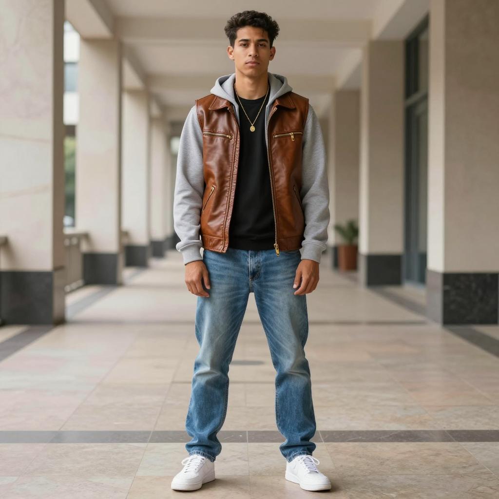 Portrait of a bearded dark-skinned man with medium build wearing a loose-fitting red hooded shirt and brown pants. He stands in front of a textured stone wall with a neutral expression. The image features an earthy color palette with overcast lighting and soft shadows, creating a slightly atmospheric mood. The man has a casual style and relaxed posture.