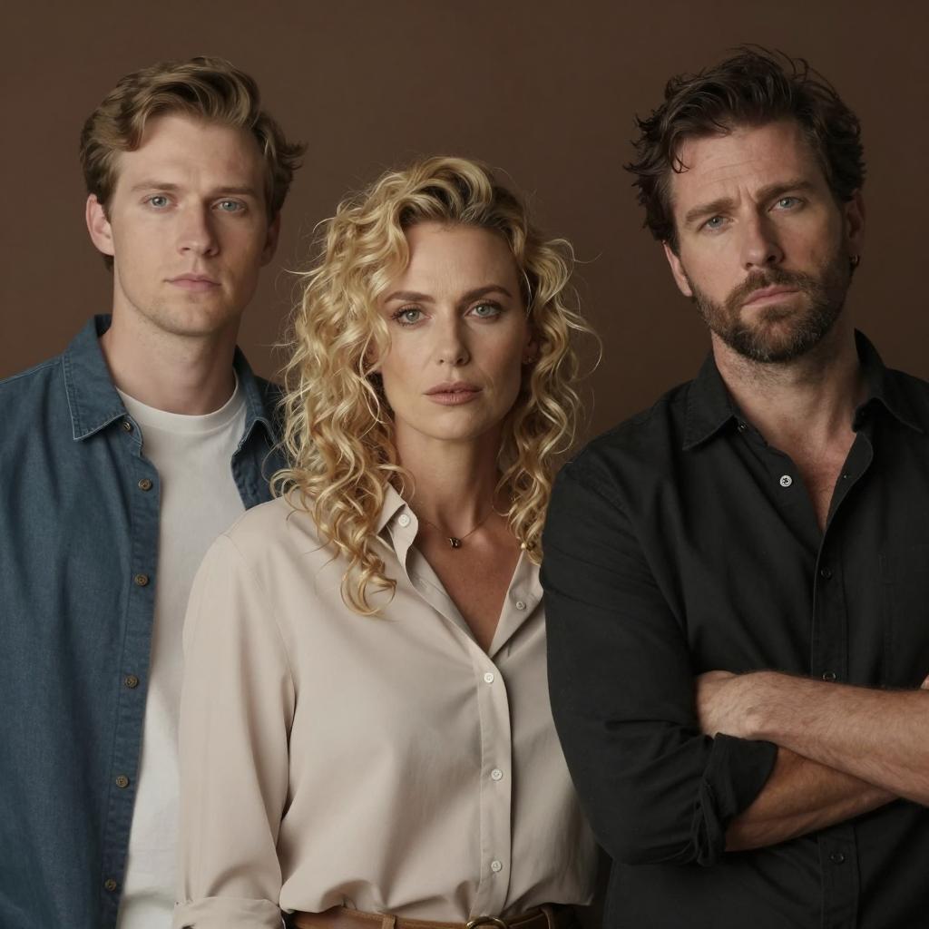 Portrait of three adults standing close together in a dark room, illuminated by a glowing red orb. The man on the left has short brown hair and a serious expression, wearing a dark jacket and shirt. The man in the center has blonde hair and an intense gaze, partially lit by the orb. The woman on the right has dark hair, a neutral expression, and wears a red scarf over a dark outfit. The background features subtle green and orange hues, adding to the atmospheric lighting.
