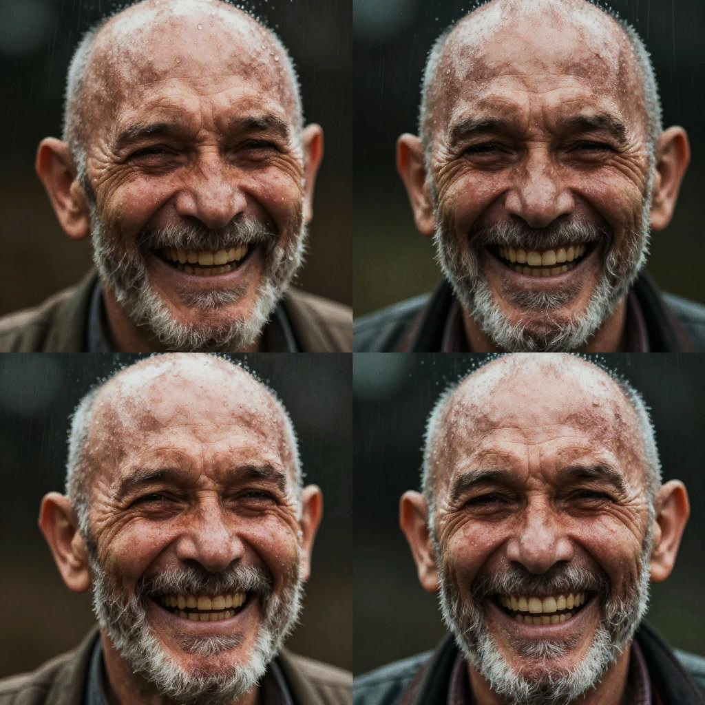 This image is a digital composite featuring four close-up photographs of an elderly man with a bald head, gray beard, and wrinkled skin. He's laughing heartily in each photo, with his eyes squinted and mouth wide open, revealing his teeth. The background is dark and blurry, making the man's joyful expressions the focal point. Raindrops are visible on his face, adding a textured, almost gritty effect to the image.