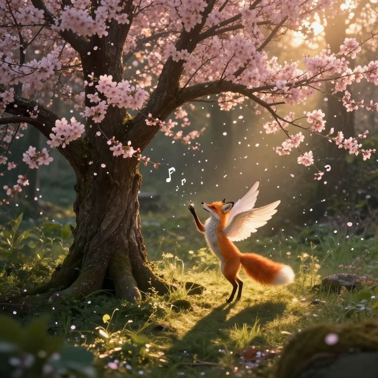 An alluring piece of digital art depicts an enchanting forest creature - a small fox-like being adorned with delicate wings - as it performs a mesmerizing serenade to a vibrant tree in full bloom during the mystical hour before dawn. From an elevated vantage point above the lush canopy, we are granted a glimpse into this ethereal scene, illuminated by the soft, golden light of the ascending sun that casts elongated shadows across the verdant forest floor. The creature's enchanting melody, a harmonious blend of earthy woodland sounds and celestial notes, resonates with the living tree, causing its branches to gently sway and flower petals to flutter down like snowflakes in an exquisite ballet of nature and magic. This captivating image conveys an emotional spectrum of serenity, wonder, and enchantment as it beckons viewers into a dreamlike realm where the mundane intertwines with the extraordinary, masterfully weaving together elements of fantasy, nature, and delicate beauty.