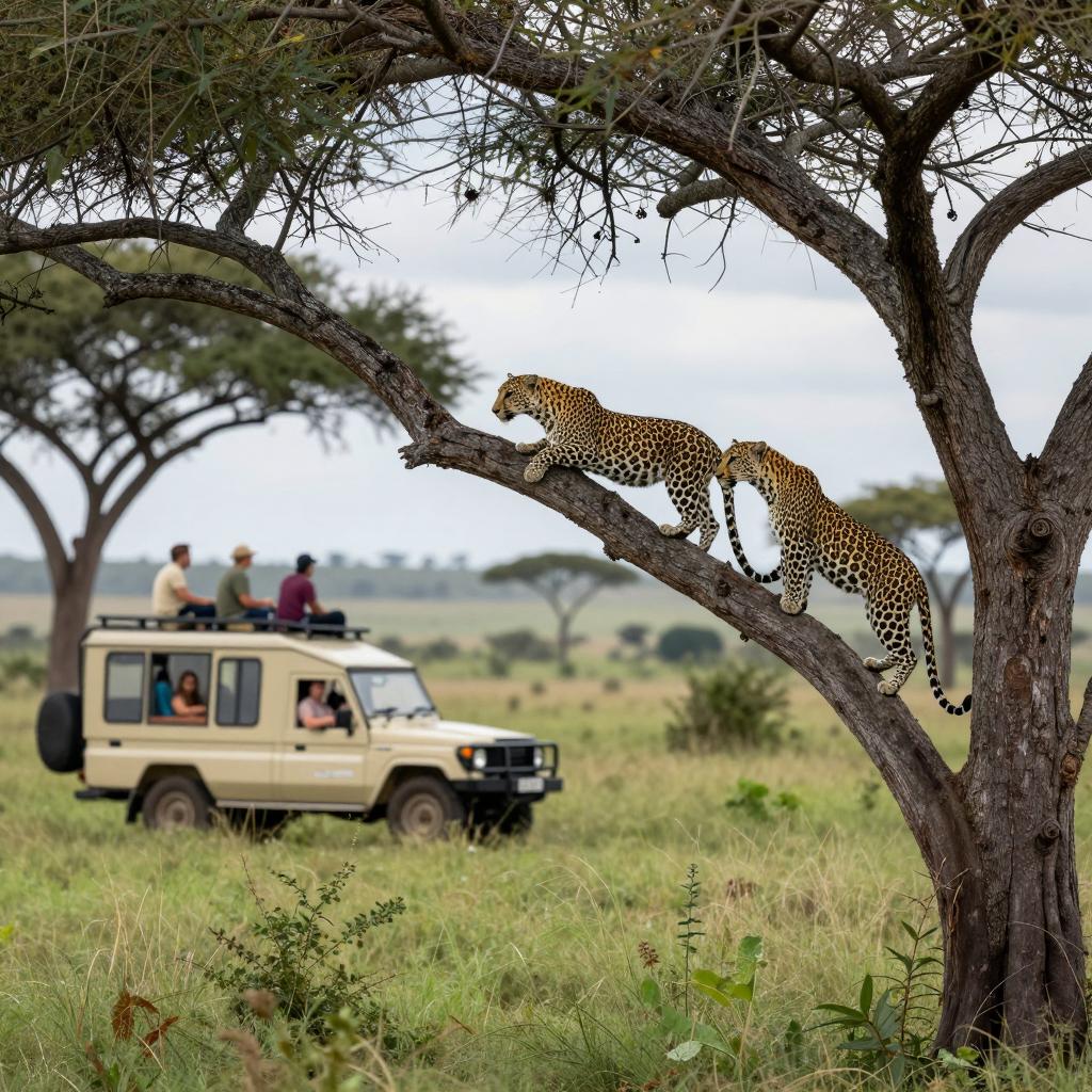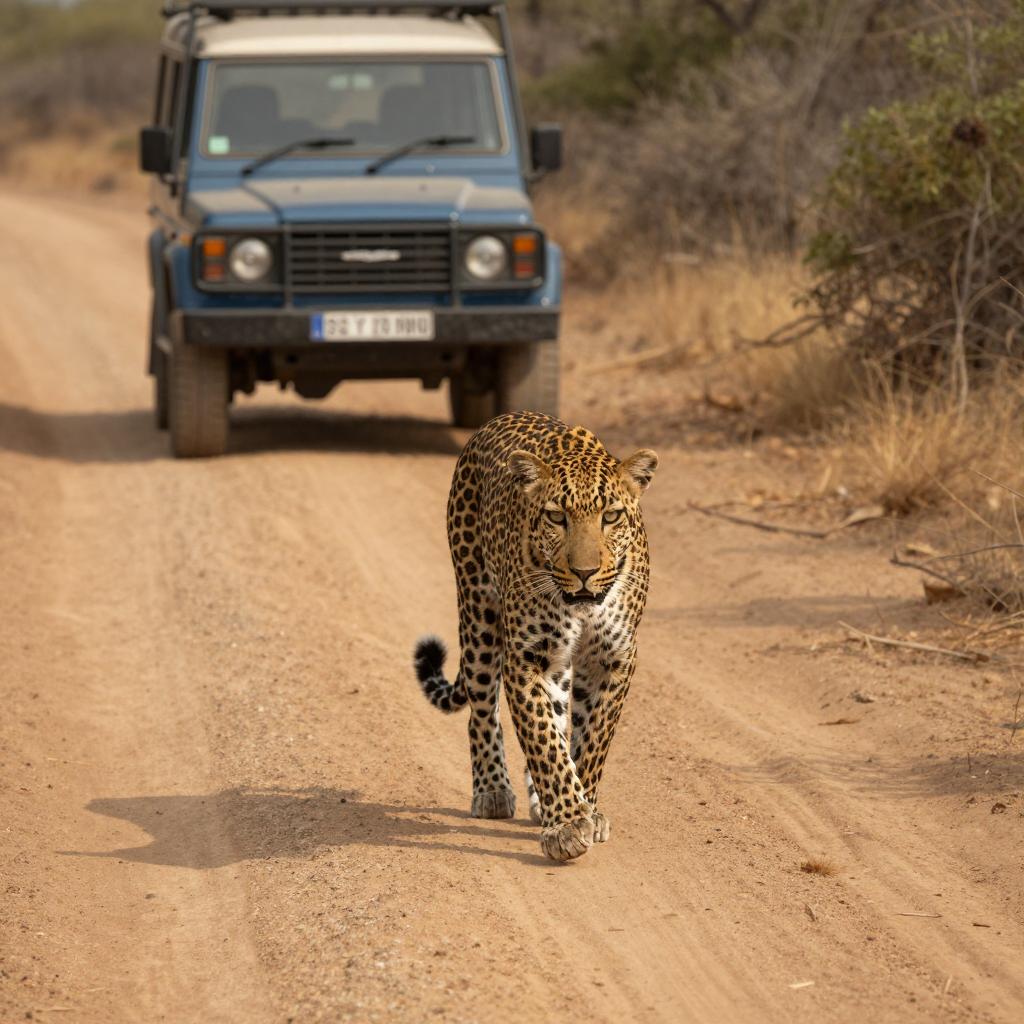 A leopard walking on a dusty dirt road in a natural environment, surrounded by sparse vegetation and bushes, a blue off-road vehicle in the background, warm natural sunlight casting shadows, wildlife realism, earthy orange and brown colors