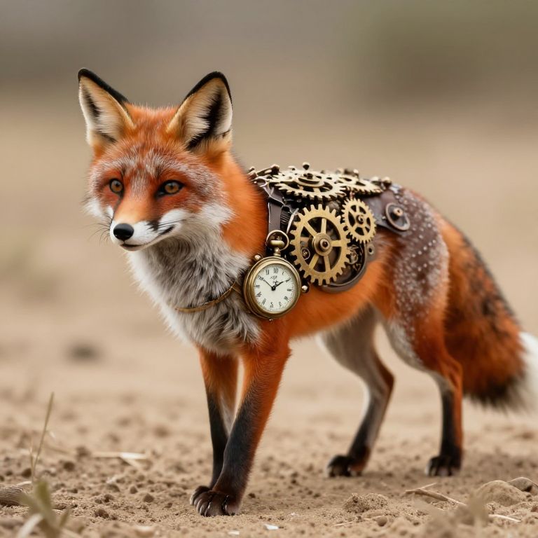 A steampunk-inspired digital artwork depicts a clockwork fox adorned with intricate brass gears and a vintage pocket watch, its fur blending seamlessly with the sandy terrain as it strides forward, evoking a sense of timeless enchantment and mechanical wonder.
