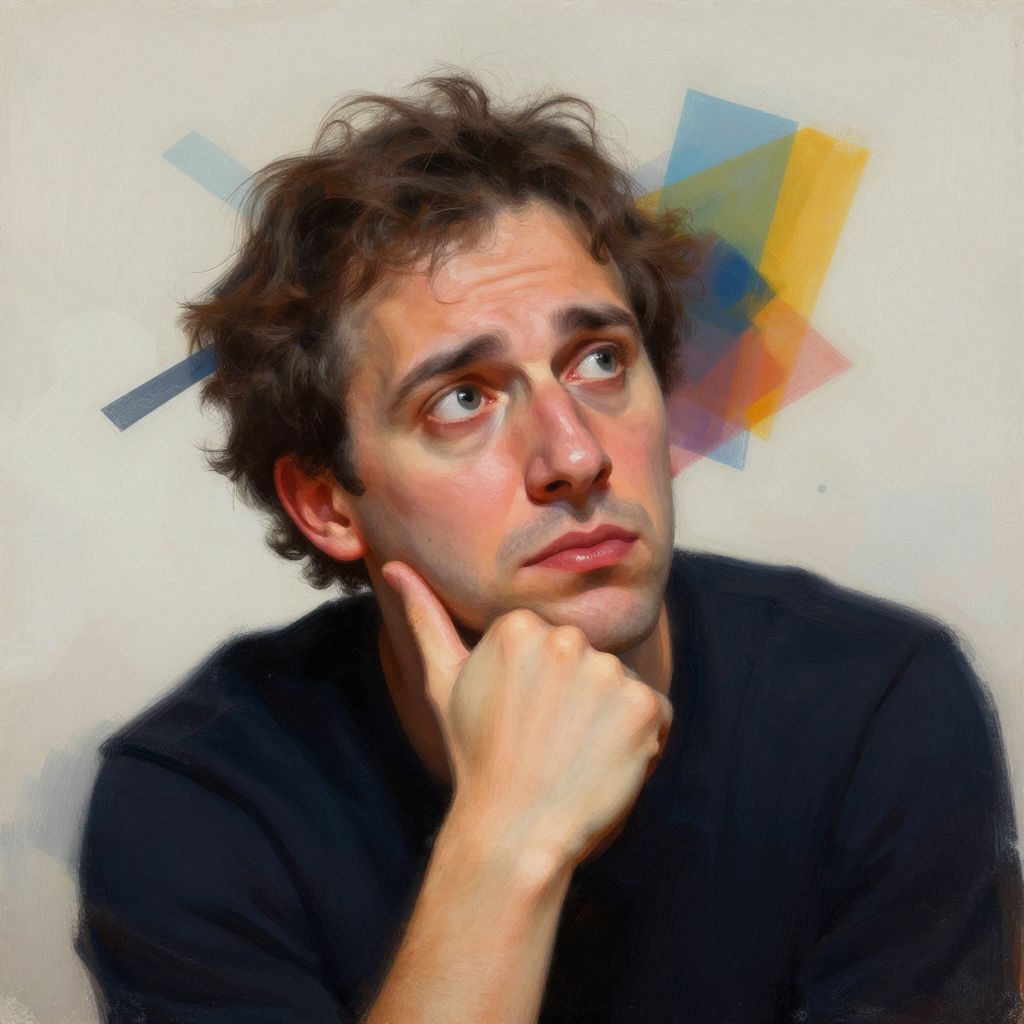 Digital portrait of a young man with curly brown hair, blue eyes, and a contemplative expression, resting his chin on his hand. Background features abstract