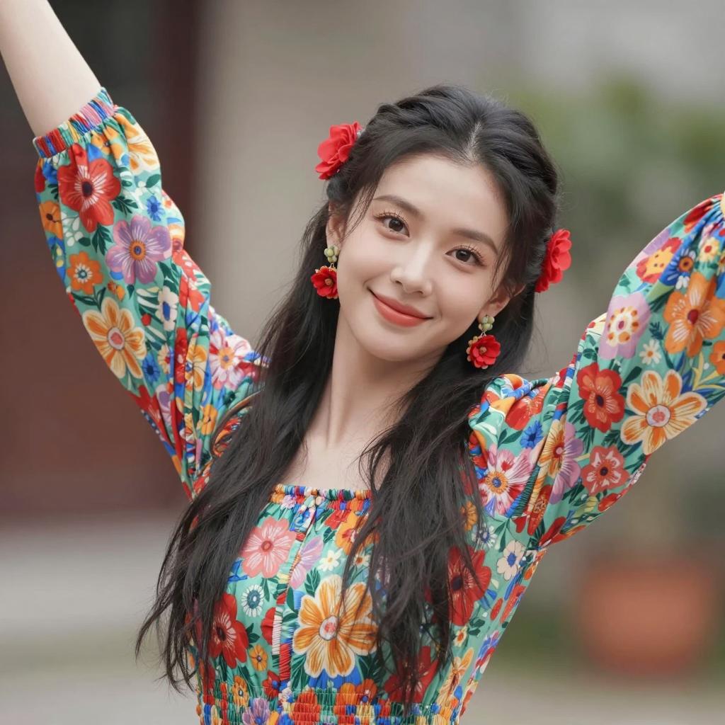 Portrait of a young Asian woman with long black hair, wearing a multicolored floral dress with long sleeves. She is smiling and posing with her arms raised, adorned with red flower hair ornaments and matching floral earrings. The background is blurred, highlighting her bright eyes and cheerful expression.