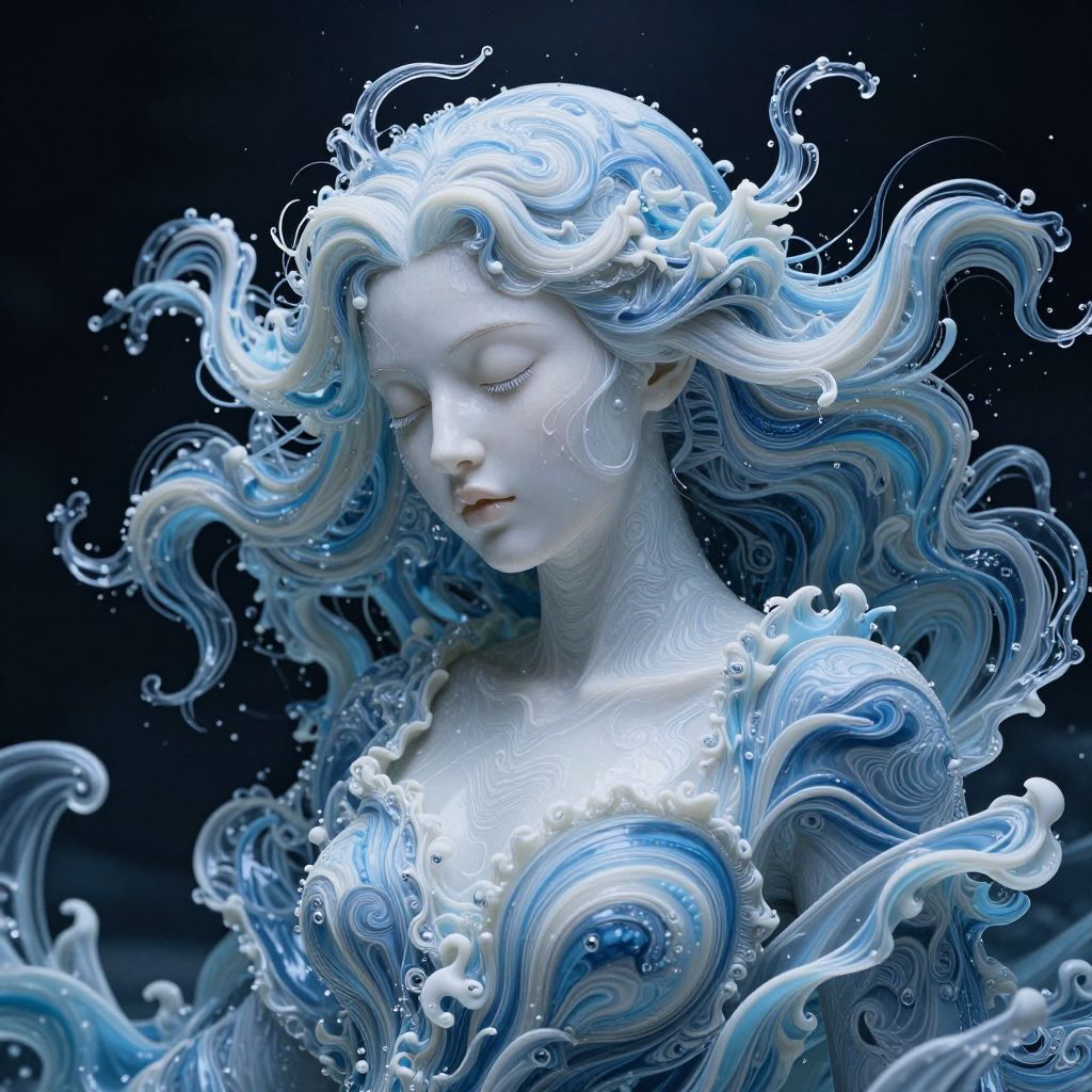 The image presents a breathtakingly intricate and hyperrealistic depiction of a woman made entirely of water. Her form is a masterful blend of fluidity and detail, with every aspect of her body, from her delicate features to her flowing hair, crafted from swirling patterns of water. The texture is both smooth and complex, with varying shades of blue and white that create a sense of depth and movement. The woman's face is serene, with closed eyes and a calm expression, adding to the ethereal quality of the image. The composition is centered, with the woman's figure taking up most of the frame, and the background is a deep, dark void that contrasts sharply with the luminous water. The overall effect is one of elegance and intricacy, with the woman's form appearing both delicate and powerful, a testament to the artist's skill in creating a masterpiece that is both visually stunning and emotionally evocative.