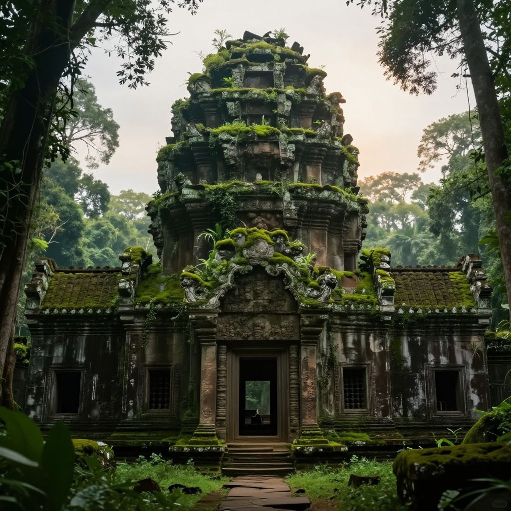 Photograph of a moss-covered, ancient stone temple with intricate carvings, surrounded by lush green trees, and overgrown foliage, capturing a mystical