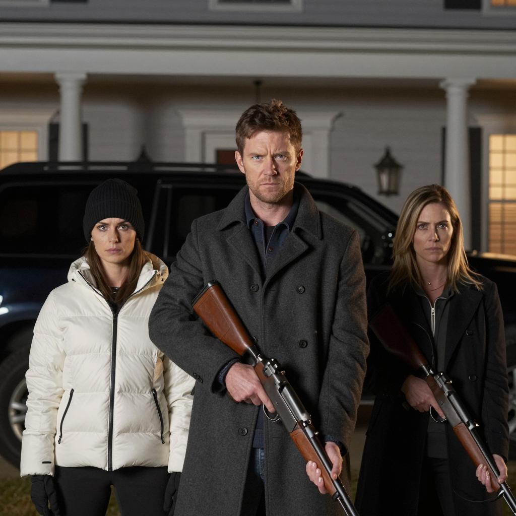 Two men in a rocky, coastal setting. The bearded man in front holds a large rifle with a belt of bullets, wearing a green shirt and black headband. The other man in a blue patterned shirt and black cap looks to his left. Both appear focused. Rocks and seaweed surround them.