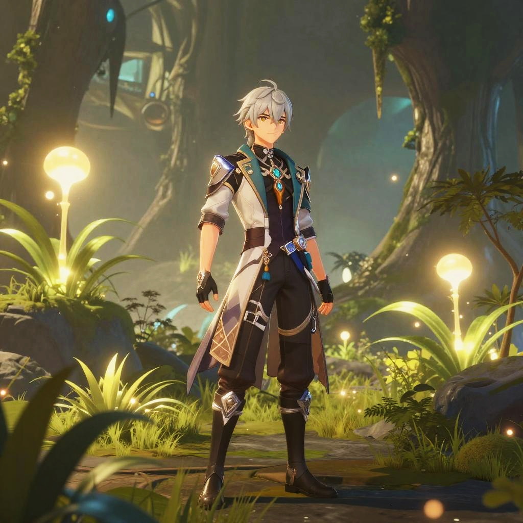 Honkai star rail male character exploring an alien world, dense glowing flora surrounding him, futuristic outfit with metallic textures, soft ambient light filtering through alien trees