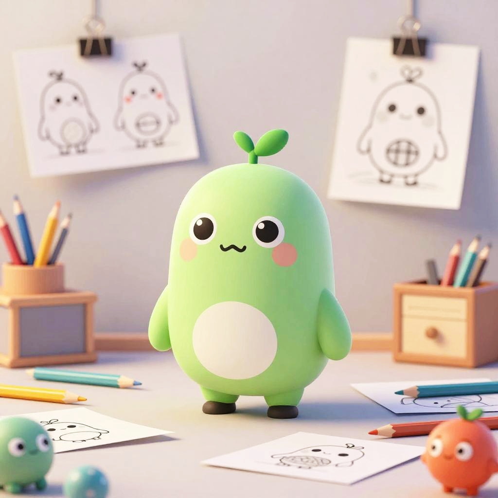 Pixar character generator illustration showcasing a creative workspace with sketches of adorable and quirky characters, colorful palettes, 3D animation style, soft shadows, bright and playful mood, detailed background