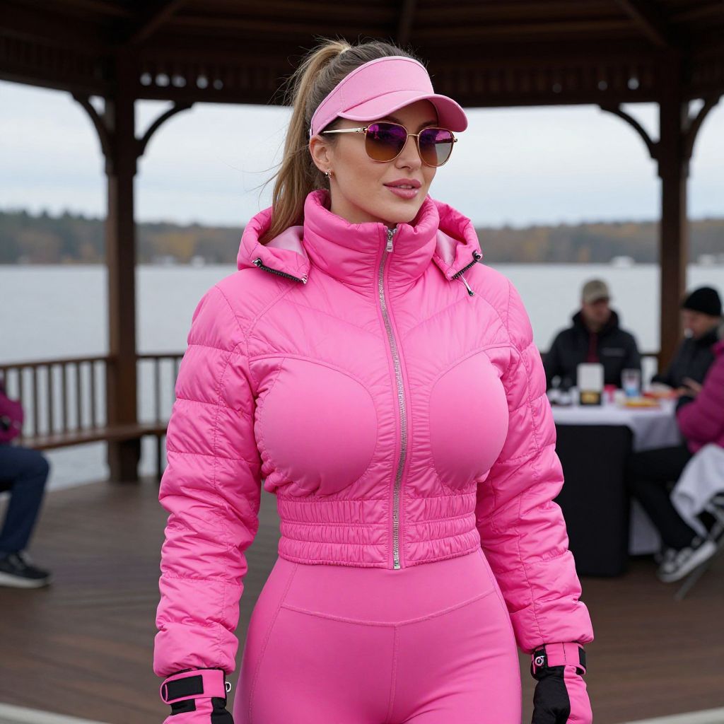 A Hourglass woman, Chuck Close style, sporty winter chic, vibrant pink quilted puffer jacket with high neck and hood, matching pink ski leggings, visor-style sunglasses with reflective pink lens, insulated pink gloves, standing at a lakeside pavilion event, enjoying the scenic view. Sexy. Pretty face and beаutiful eyes. Big breasts